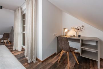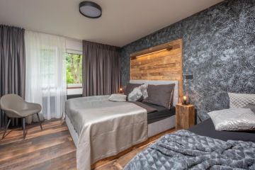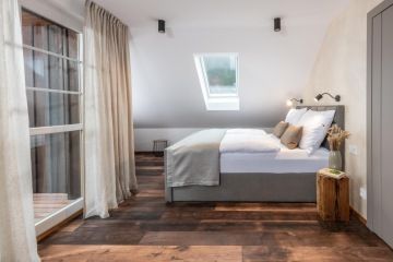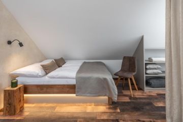 Podkrovní apartmán ve třetím patře je vhodný pro ubytování až 6 osob. Disponuje dvěma oddělenými ložnicemi - v první najdete dvě manželské postele a možnost vstupu na balkon, ve druhé dvě jednolůžka.