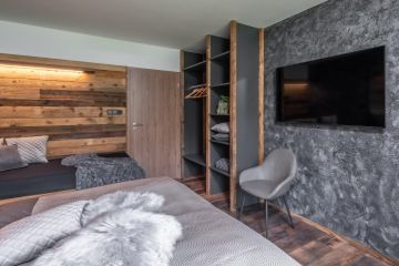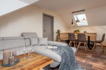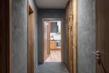 Apartmán je vhodný až pro šest osob. Disponuje dvěma ložnicemi s manželskou postelí, z nichž v jedné je navíc jednolůžko, a dále velkou přistýlkou v obývacím pokoji.