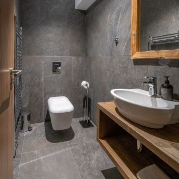 Dostatek komfortu a soukromí v apartmánu zajišťují dvě koupelny se sprchovým koutem a dvě toalety zvlášť.